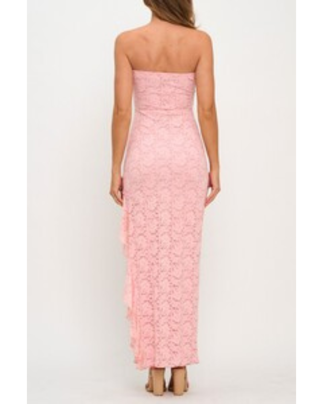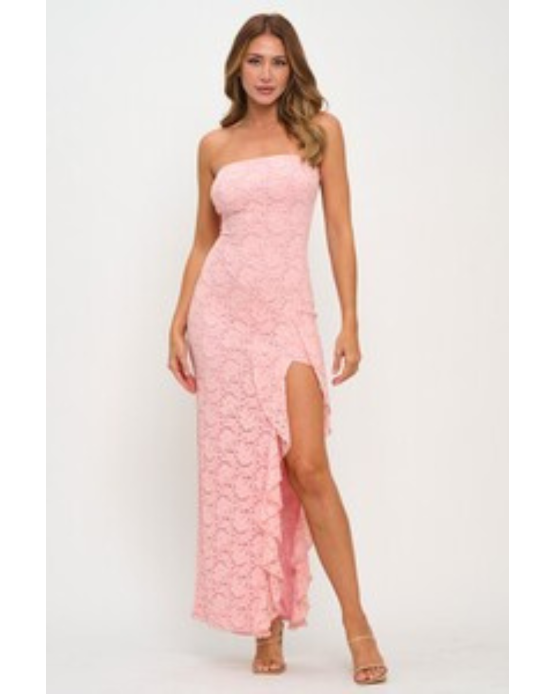 Slip into the Azalea and turn heads with its sultry silhouette. This lace maxi dress features a chic tube neckline and daring high slit adorned with a playful ruffle hem that adds movement and sass. Fully lined for comfort and confidence, this dress is your go-to for nights when you want to feel bold and beautiful. Perfect for date night or any occasion where you're ready to make a statement.