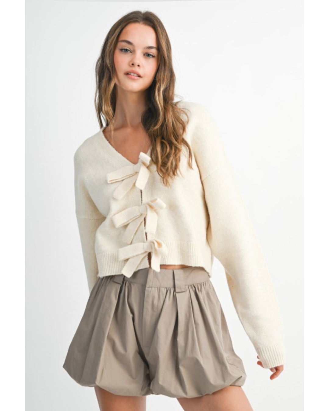 This stylish Dee Sweater features a versatile v-neck design with a delicate ribbon bow trim that can be showcased on either the front or back, allowing you to switch up your look effortlessly. Crafted from a soft solid knit, it offers both comfort and elegance, perfect for elevating any outfit with a subtle, chic detail.