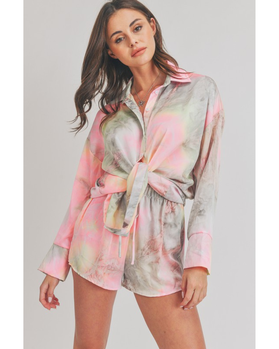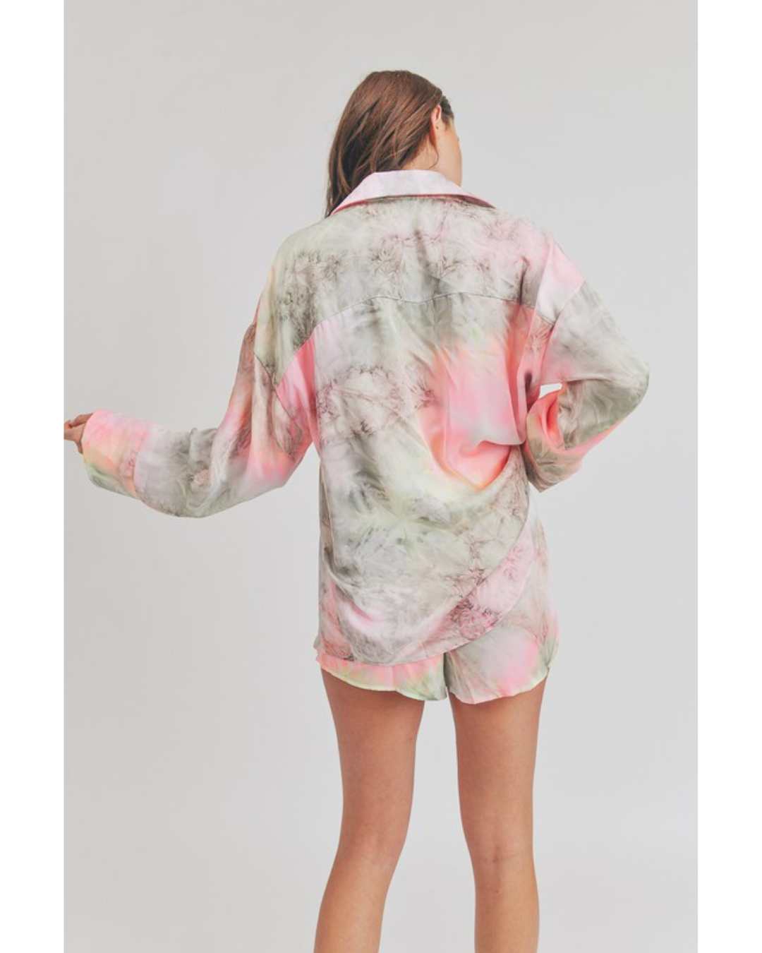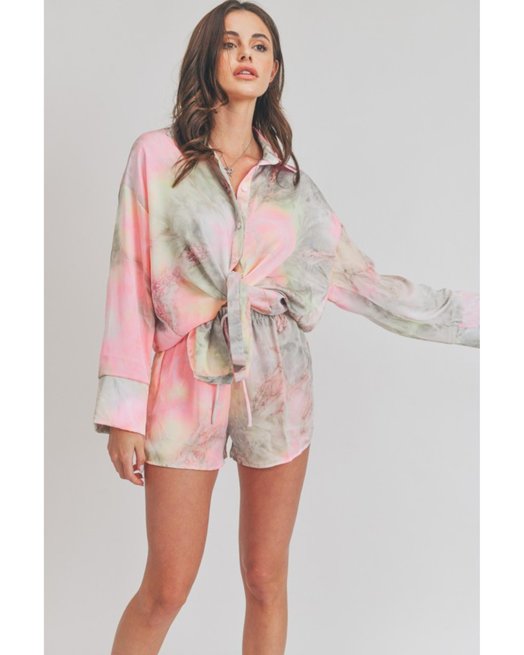 Refresh your casual wardrobe with the Elenor Set, featuring a trendy acid wash tie dye design in soft grey and pink tones. This coordinated two-piece set includes a long sleeve shirt and matching shorts, perfect for laid-back days or weekend adventures. The unique tie dye pattern adds personality and visual interest, while the comfortable fit makes it ideal for lounging or running errands. Mix and match with your favorite accessories for endless styling possibilities.