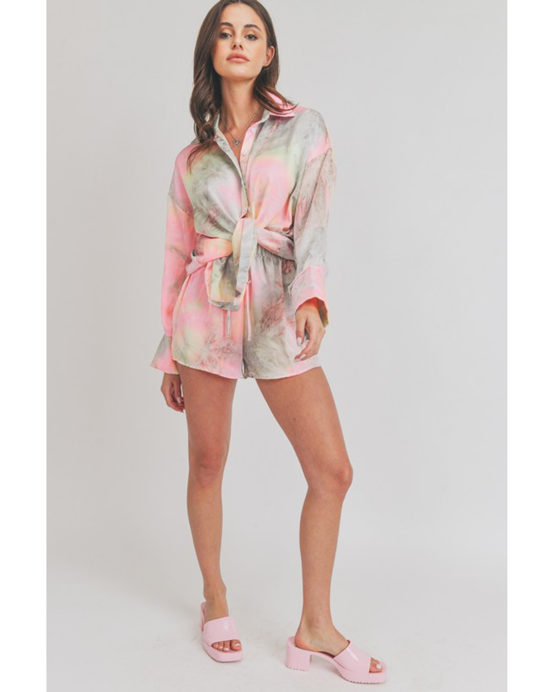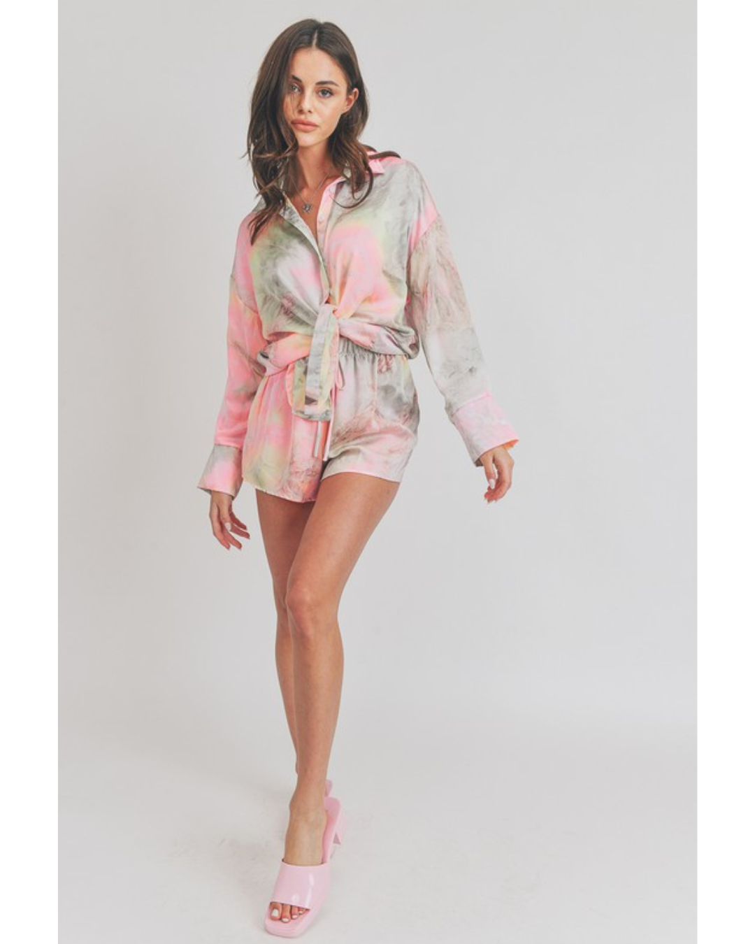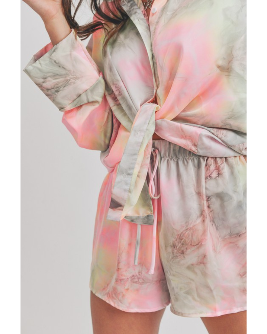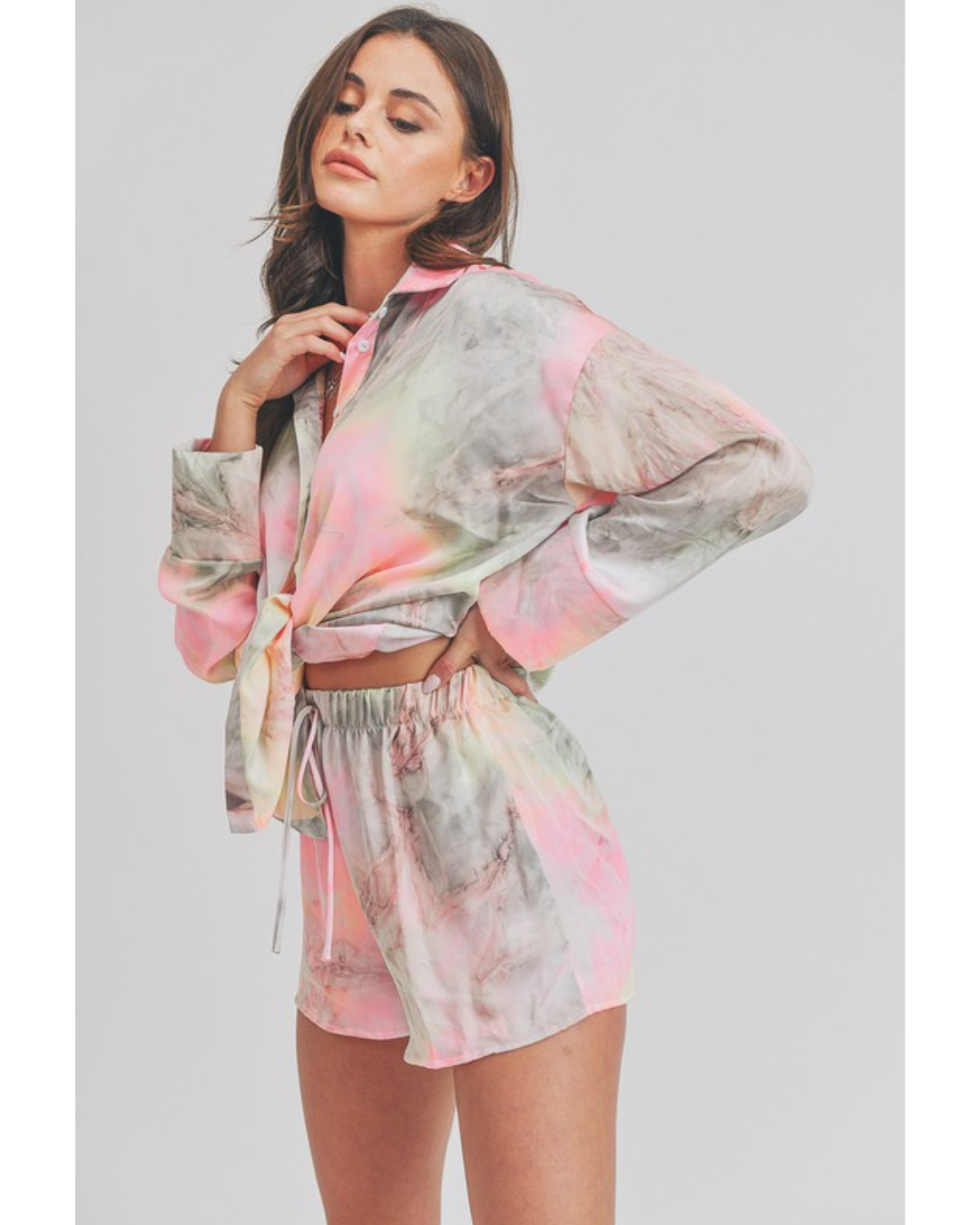 Refresh your casual wardrobe with the Elenor Set, featuring a trendy acid wash tie dye design in soft grey and pink tones. This coordinated two-piece set includes a long sleeve shirt and matching shorts, perfect for laid-back days or weekend adventures. The unique tie dye pattern adds personality and visual interest, while the comfortable fit makes it ideal for lounging or running errands. Mix and match with your favorite accessories for endless styling possibilities.
