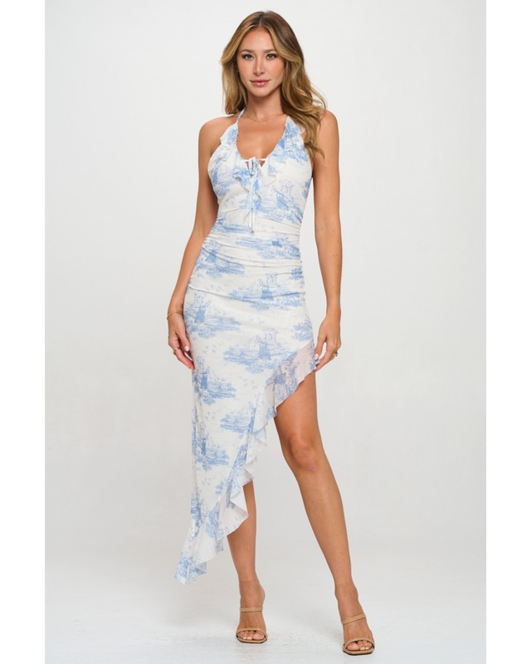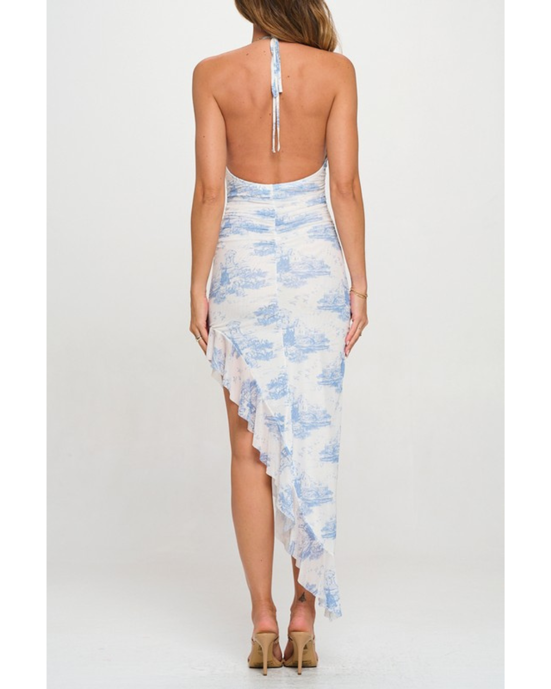 Turn heads this season in the Ester maxi dress, a stunning piece that combines elegance with playful details. Featuring a scenic mesh print and a flattering halter neckline with charming ruffles, this dress offers a self-tie strap bust detail and ruched sides for a refined silhouette. The asymmetrical ruffle hem adds movement and dimension, while the full lining ensures comfort all day long. Perfect for garden parties, beach weddings, or sunset celebrations.