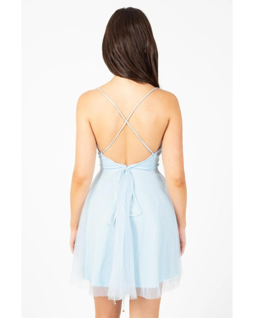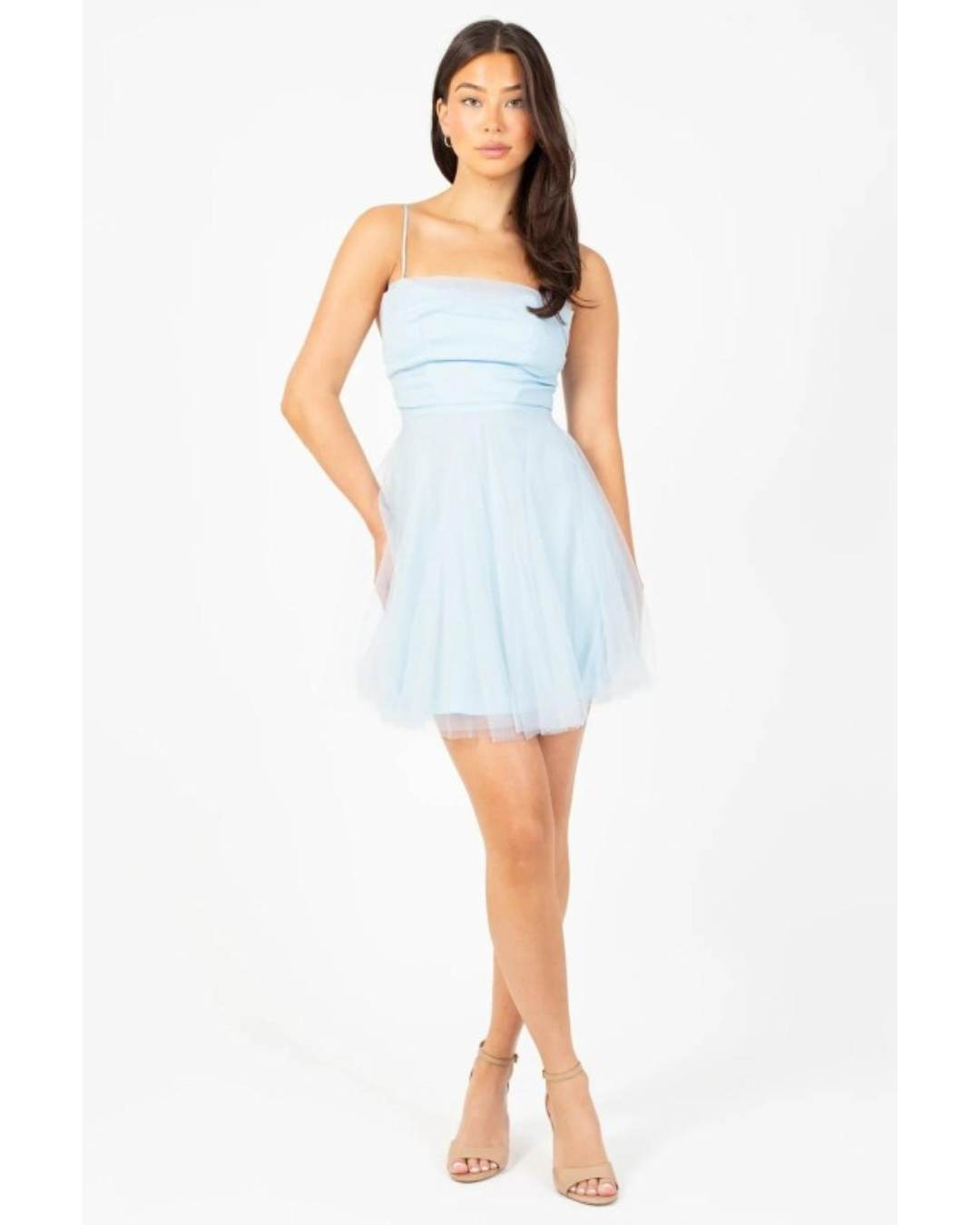 Drift into dreamland in the Everest, a whimsical light blue mini dress that captures pure magic. The fitted, smocked bodice sits delicately on a square neckline, supported by delicate spaghetti straps that whisper elegance. Layers of airy tulle cascade into a playful, voluminous skirt with a tutu-like charm, hitting perfectly at mid-thigh. Perfect for twirling through enchanted moments and creating memories that sparkle.