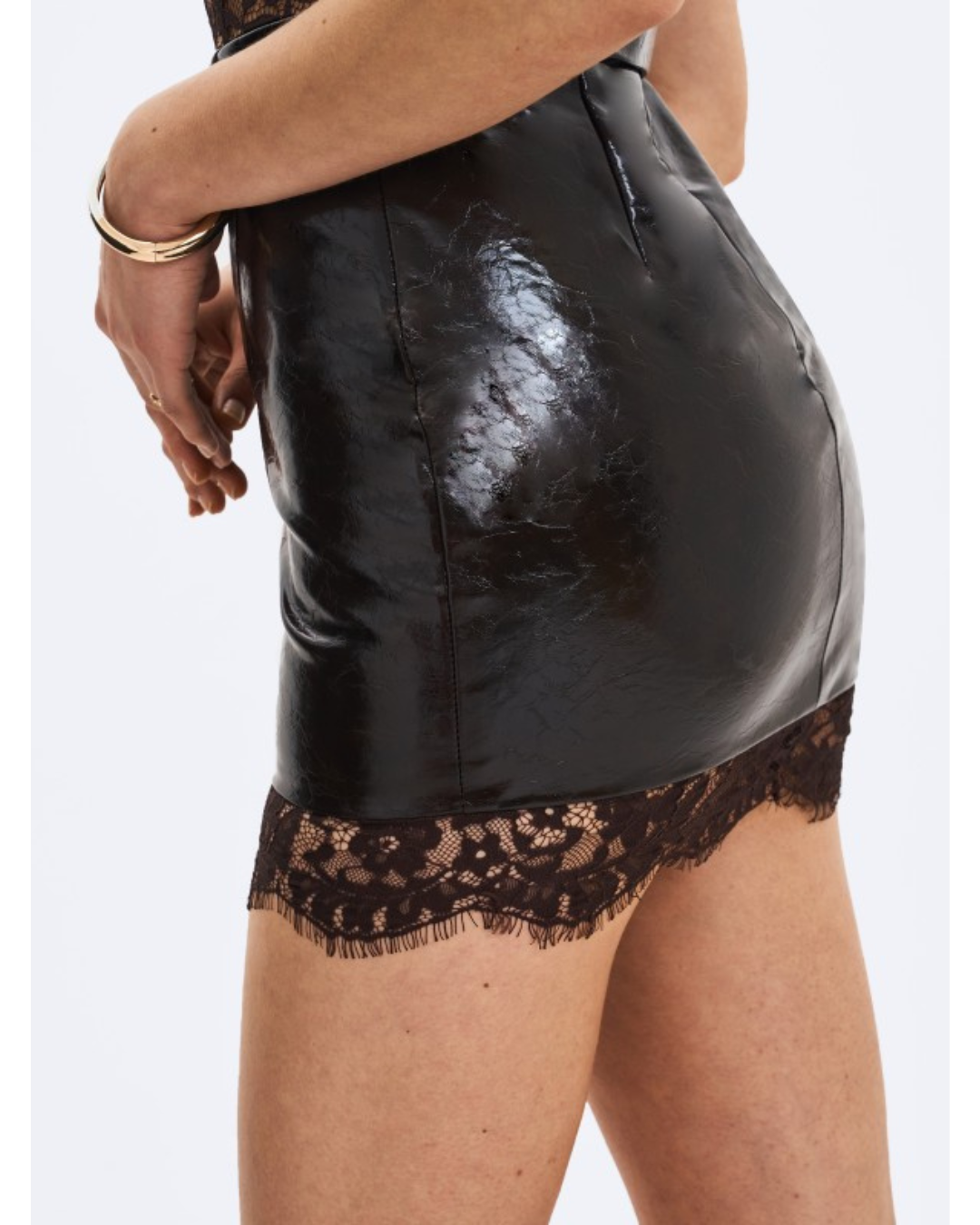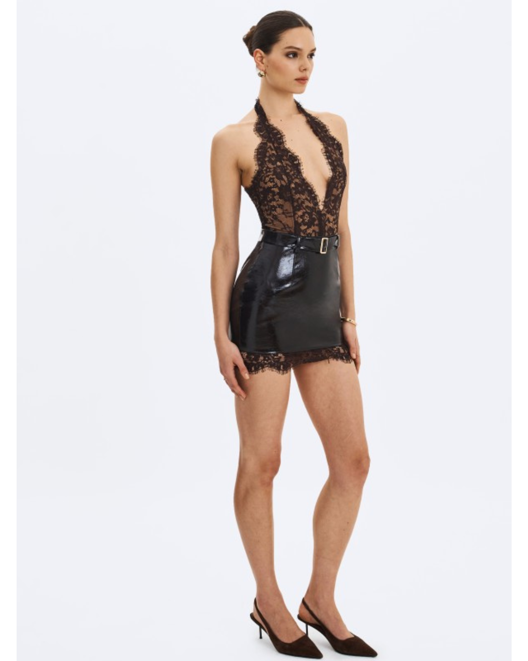 The Faris Mini combines bold sophistication with comfortable wear. Crafted from faux leather and delicate lace, this plunging halter dress features a cinched waist belt that defines your silhouette. With a mid-stretch fabric blend, it moves with you while maintaining its shape. The mini length hits just below the hip for a flattering, statement-making look. Perfect for nights out or special occasions when you want to turn heads.