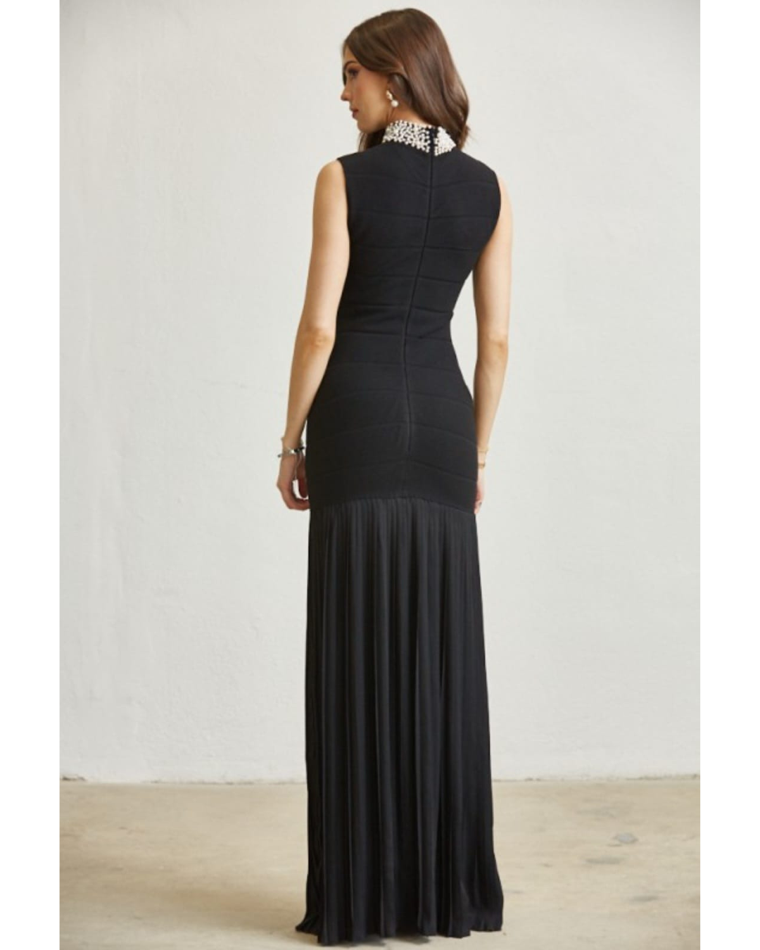 Shine bright in this black maxi dress that’s equal parts elegant and bold. The soft, stretchy bandage knit hugs your curves with a bodycon fit, while the mock neck and sleeveless cut keep it sleek and modern. Hand-embellished rhinestone pearl details add subtle sparkle and luxe texture. The drop waist flows into a pleated dobby chiffon skirt for a graceful, feminine finish. A discreet back zipper ensures a smooth, comfortable fit.