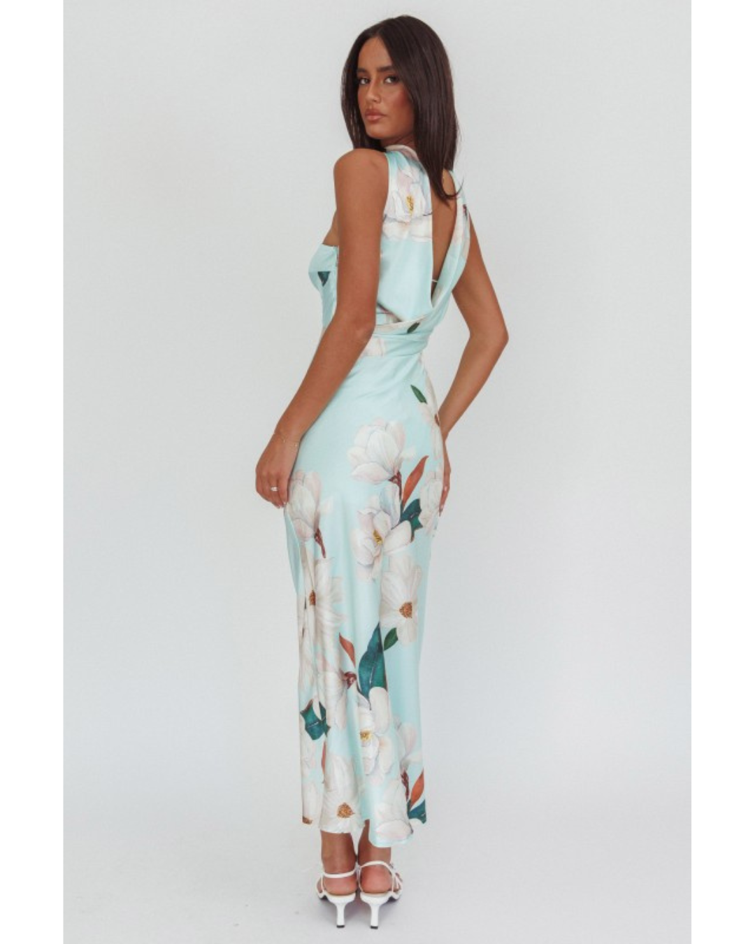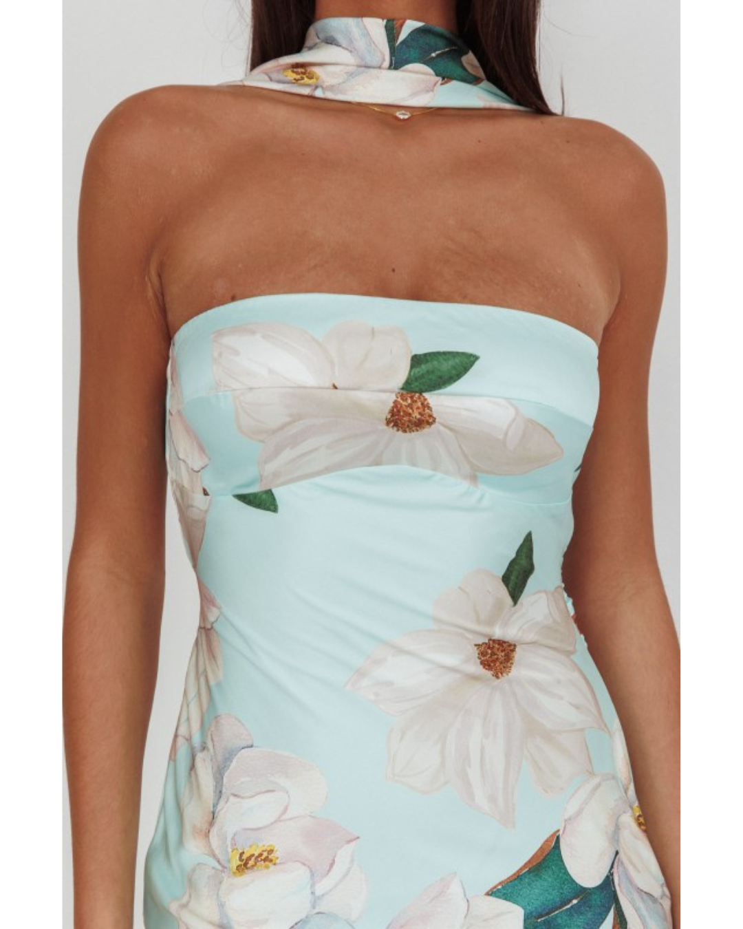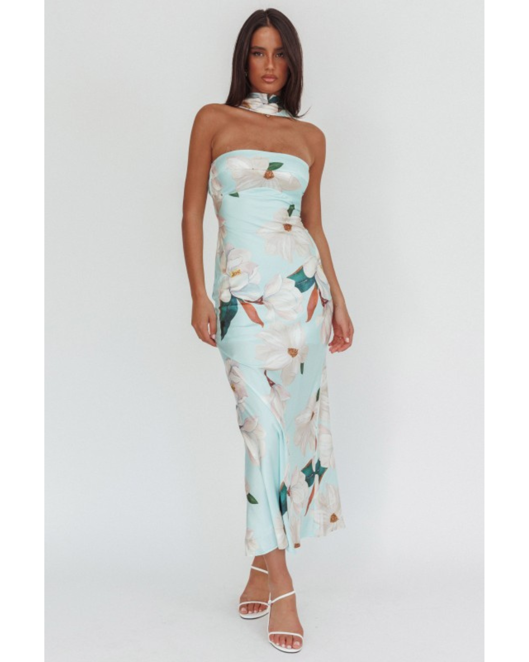 Turn heads in this breezy halter maxi dress, where soft light blue meets a riot of botanical beauty. Large white flowers bloom across the fabric alongside verdant green leaves and warm whispers of brown and orange, creating a garden-inspired look that feels fresh and effortless. The strapless silhouette pairs perfectly with a high halter neckline that ties at the back, offering both comfort and a flattering frame. Floor-length and flowing, this dress captures the essence of sun-soaked days and carefree moments—ideal for beach weddings, garden gatherings, or anywhere summer takes you.