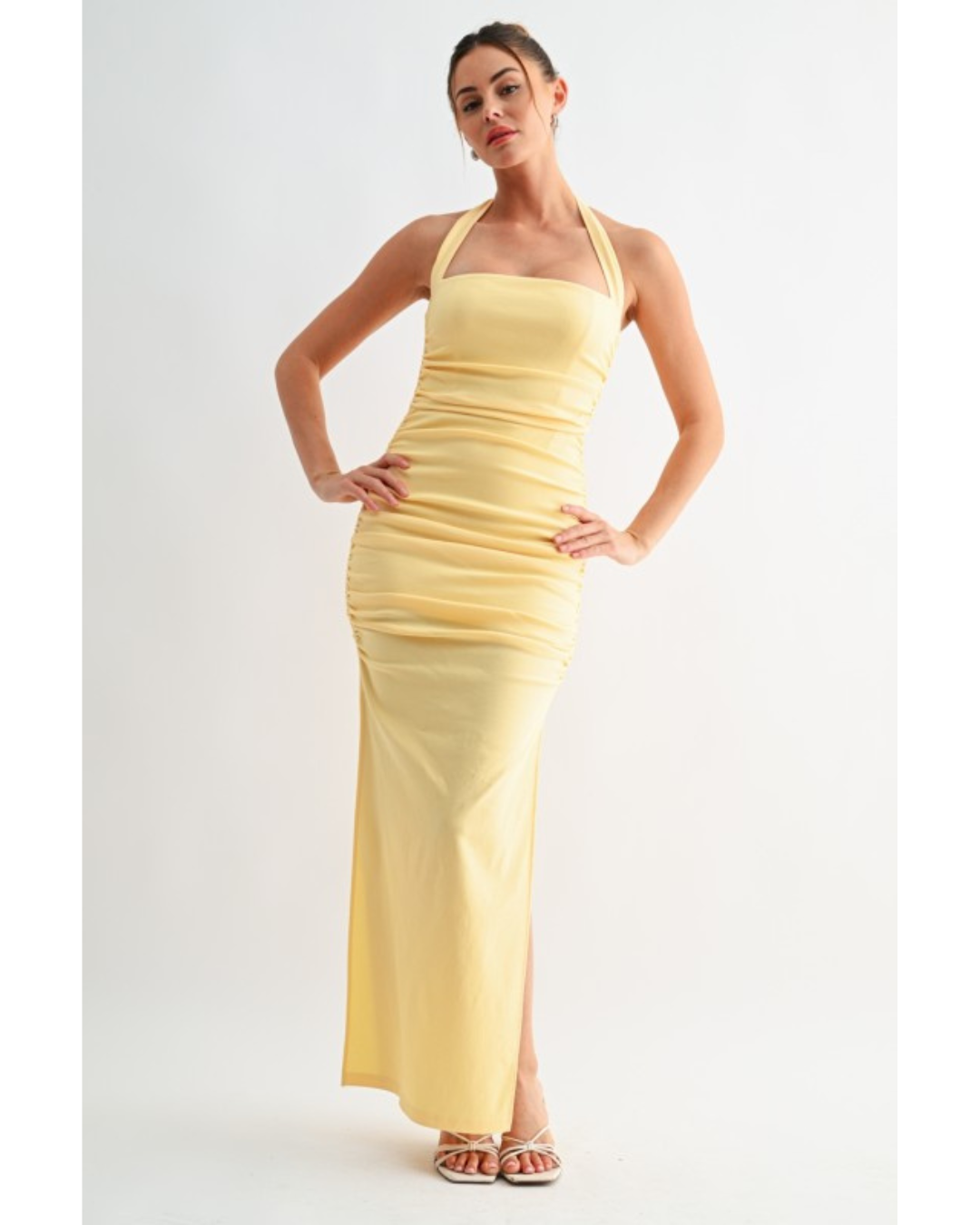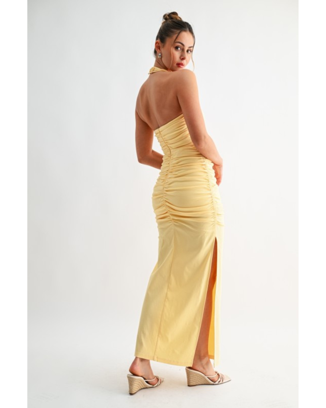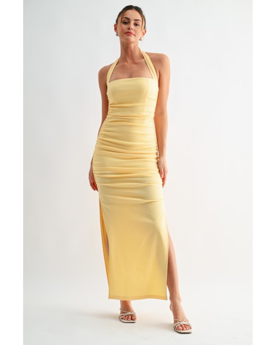Step into the spotlight with Marigold, a radiant maxi dress that celebrates your silhouette with understated glamour. The soft, ruched fabric sculpts beautifully while the straight neckline and adjustable halter straps—secured with two back buttons—create a refined, customizable fit. A sleek bodycon design hugs your curves, while a strategically placed side slit provides graceful movement and subtle sophistication. The hidden back zipper delivers a flawless, uninterrupted line. From summer celebrations to intimate evenings away, this dress embodies effortless elegance for those moments when you want to feel absolutely luminous.