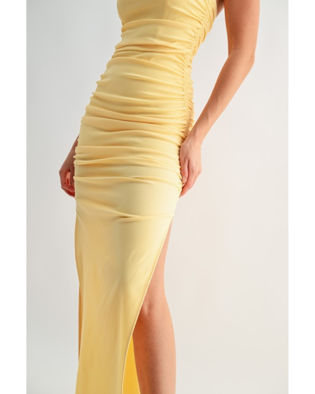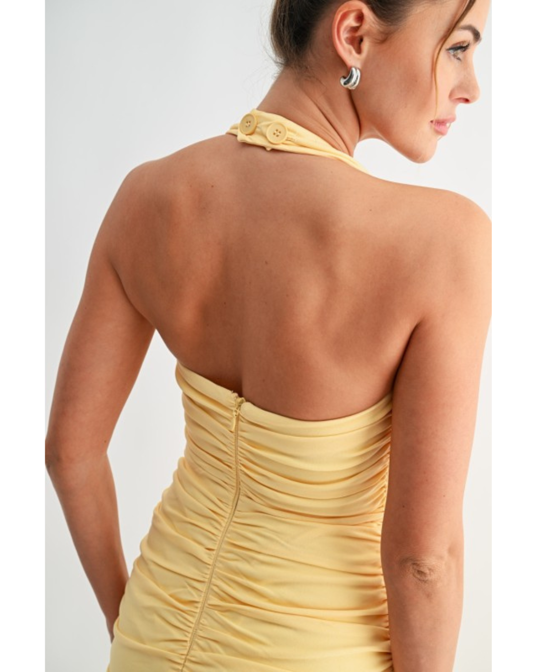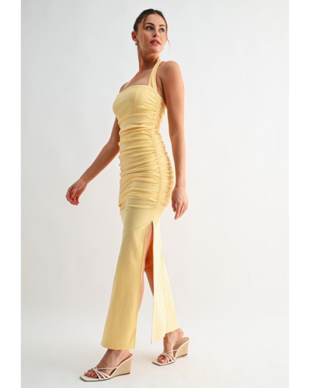 Step into the spotlight with Marigold, a radiant maxi dress that celebrates your silhouette with understated glamour. The soft, ruched fabric sculpts beautifully while the straight neckline and adjustable halter straps—secured with two back buttons—create a refined, customizable fit. A sleek bodycon design hugs your curves, while a strategically placed side slit provides graceful movement and subtle sophistication. The hidden back zipper delivers a flawless, uninterrupted line. From summer celebrations to intimate evenings away, this dress embodies effortless elegance for those moments when you want to feel absolutely luminous.
