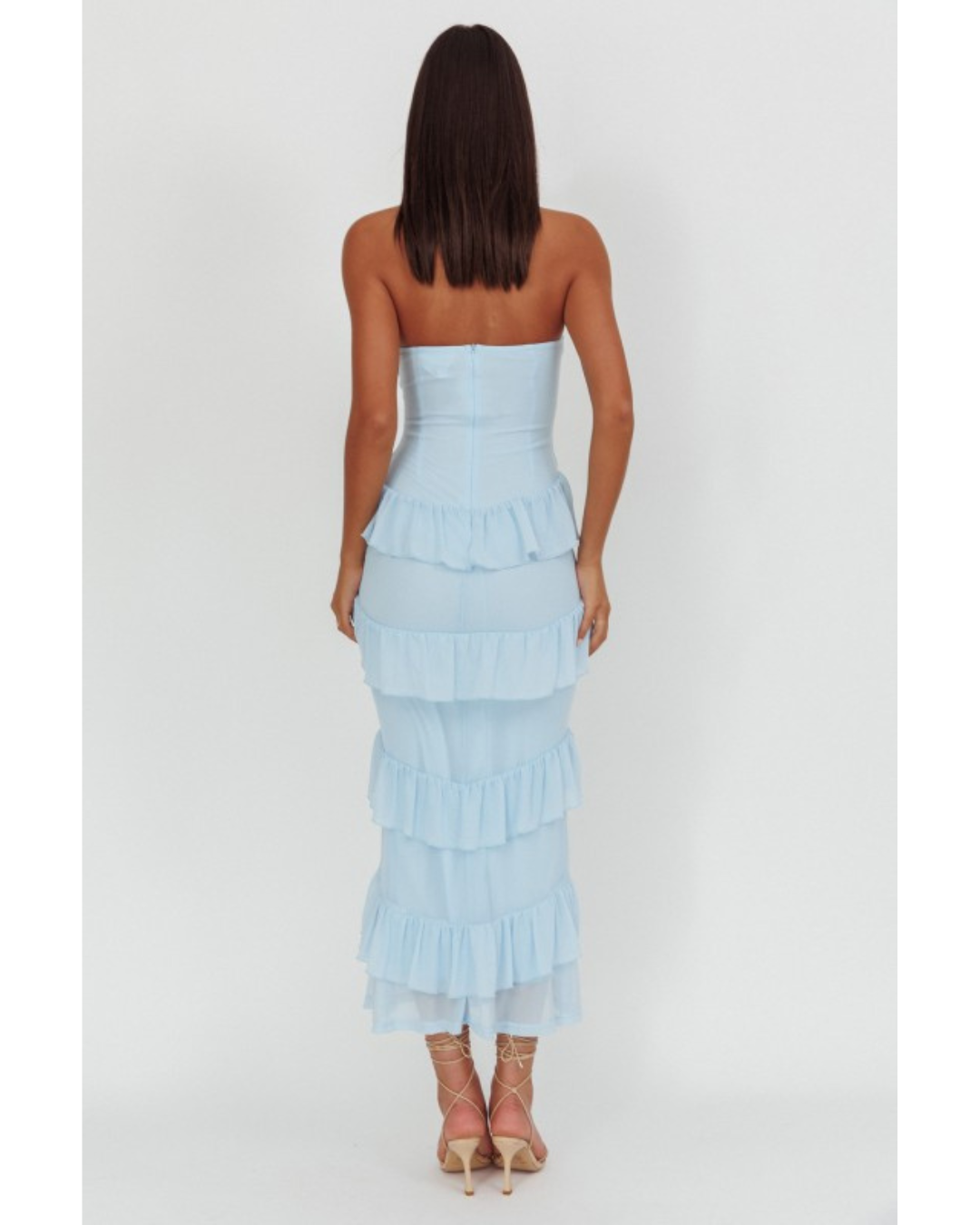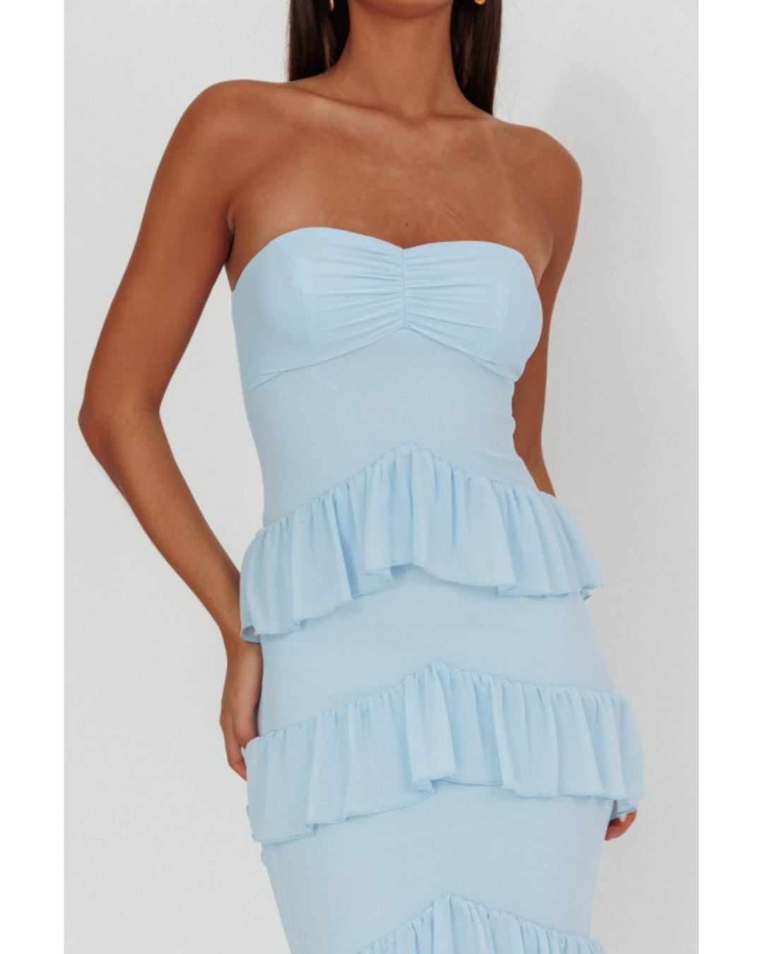 Introducing the Meadow—an enchanting dress designed to make you feel absolutely radiant. This stunning sweetheart neckline dress features a strapless silhouette with delicate ruching across the fitted bodice, creating beautiful dimension and movement. The skirt cascades with multiple tiers of ruffled fabric that flow gracefully to the floor, delivering a romantic, voluminous effect. Perfect for special occasions, this dress combines elegance with whimsical charm, allowing you to move with confidence and grace.