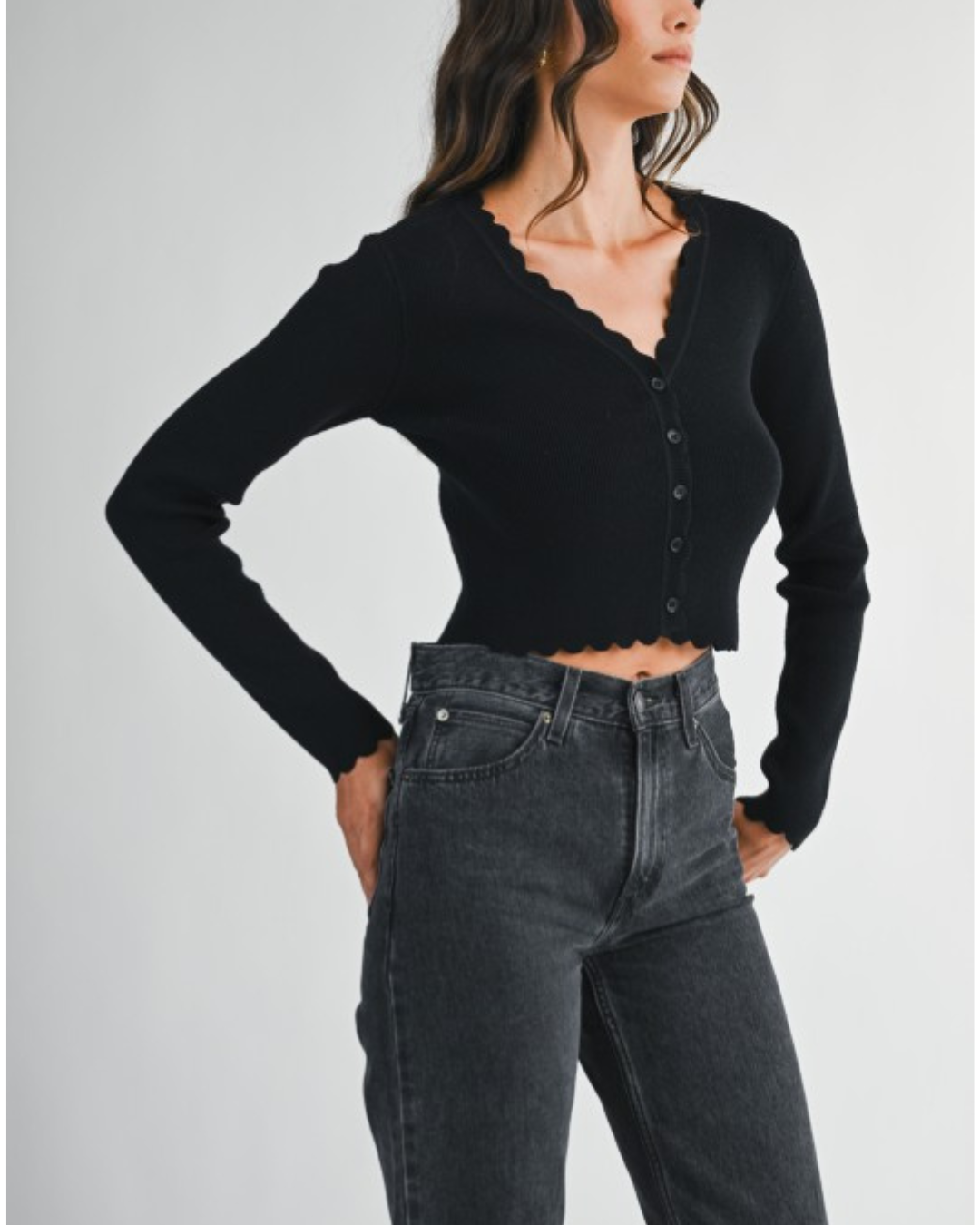 Feminine meets flirty in this must-have ribbed knit cardigan. Designed with a flattering V-neckline and delicate scalloped edges, this long sleeve crop top adds the perfect touch of charm to any outfit. The soft, stretchy fabric hugs your figure comfortably, while the functional button-down front offers versatile styling — wear it solo or layered over your favorite cami. Whether you're dressing it up or keeping it casual, this cardigan is your new go-to for effortless style.
