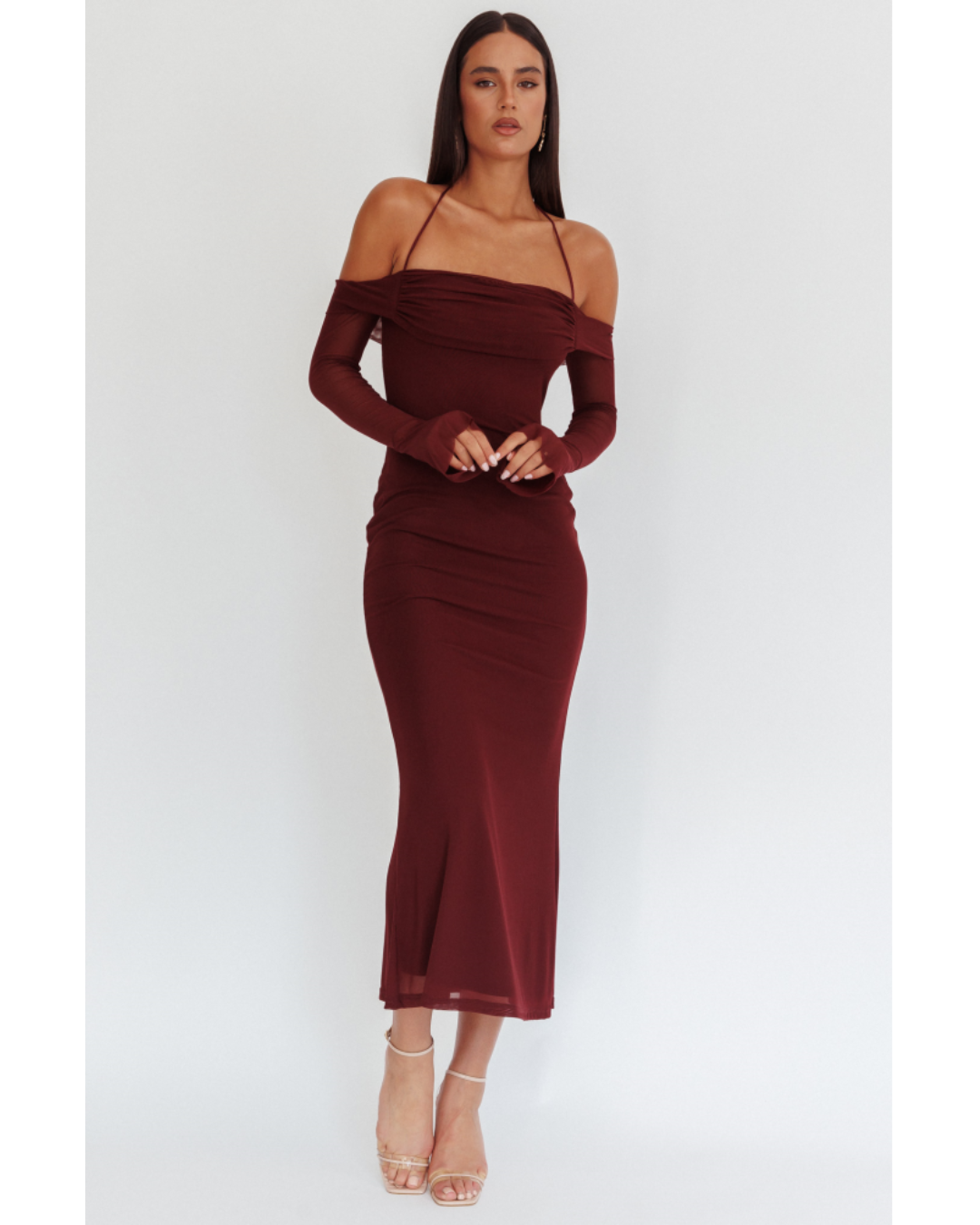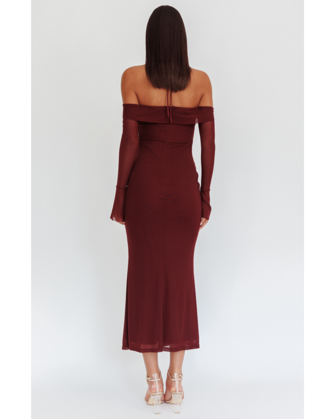 Turn heads in this off-shoulder chocolate mesh maxi dress that blends sexy and sophisticated effortlessly. The fitted silhouette features a flattering off-the-shoulder neckline with an adjustable drawstring for a custom fit. Crafted from sheer mesh fabric with a comfortable lining, it shows just the right amount of skin, while the open back adds a bold, unforgettable touch.