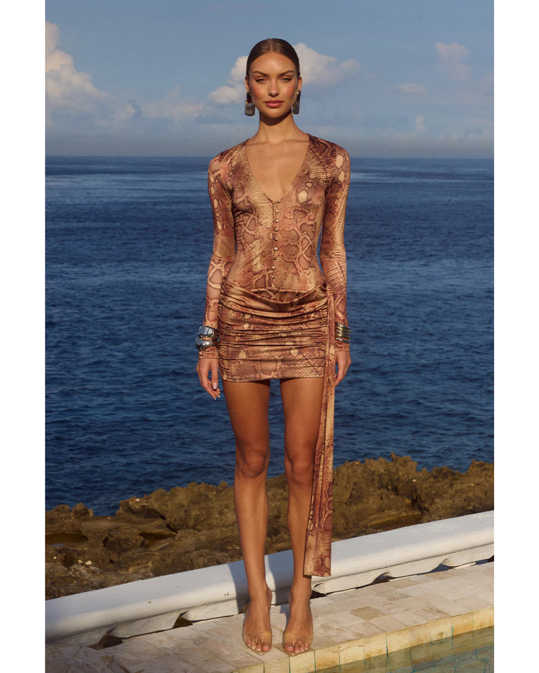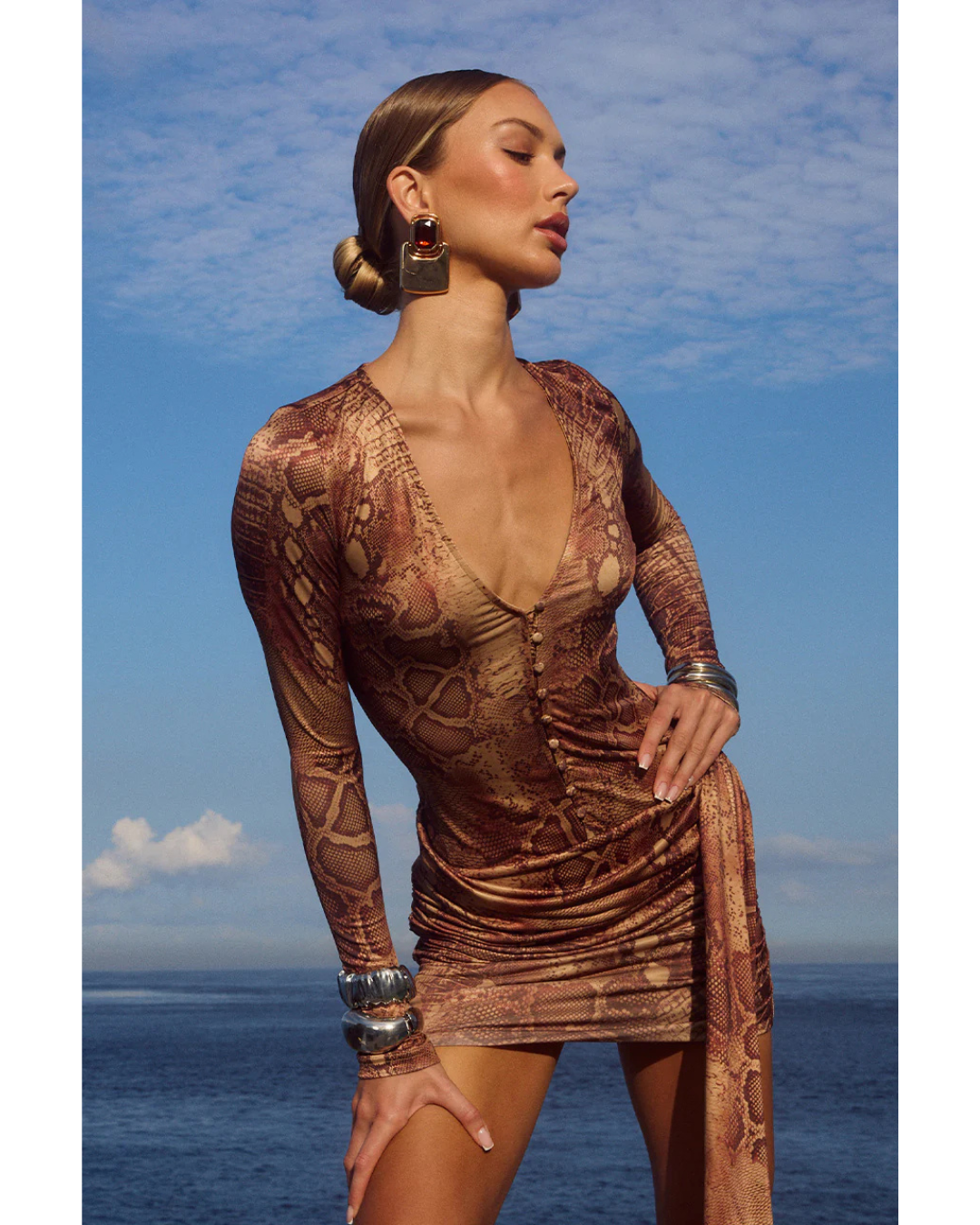 Crafted from luxe second-skin fabric, the Rue Mini in Viper Print hugs your silhouette with seductive ruching around the hips and a dramatic side sash. This mini dress features long sleeves and a sleek button closure, blending edgy style with confident ease. Fully lined with stretch, it moves with you for a fierce, bold look that commands attention.