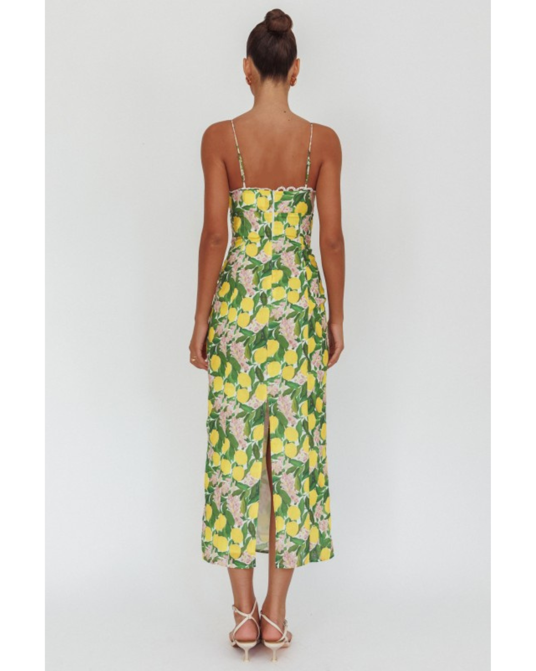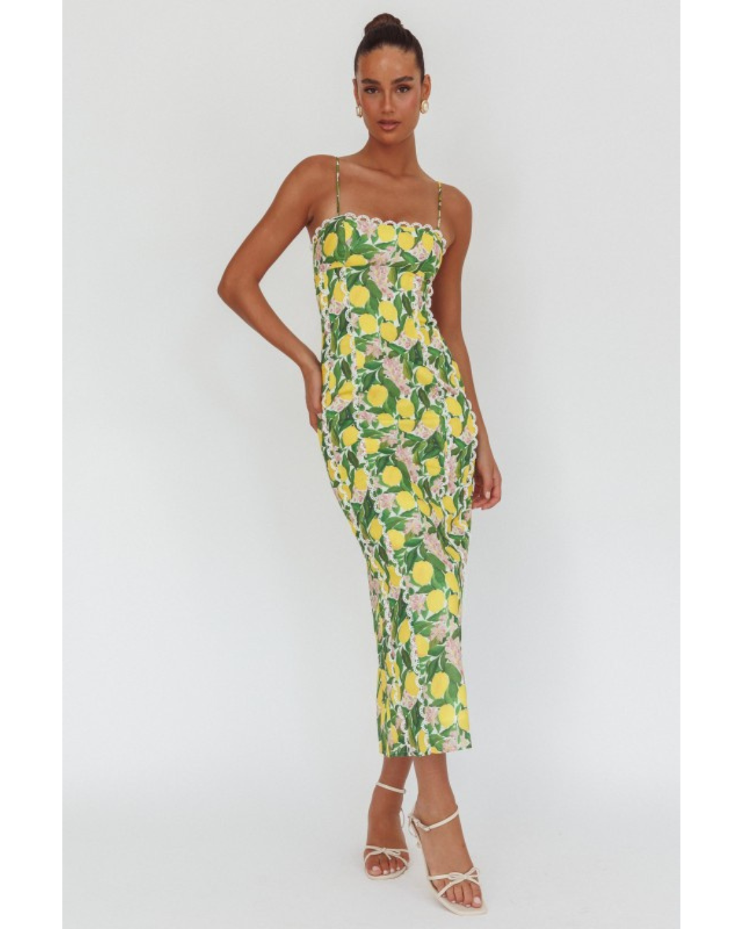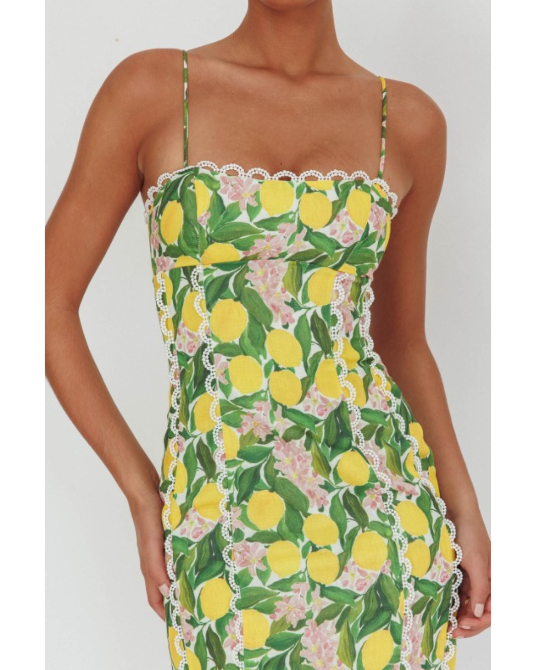 Escape to the Italian coast with the Sorrento dress—a breezy sleeveless midi that brings sunshine to your wardrobe. Vibrant yellow lemons and soft pink blossoms dance across lush green leaves in a cheerful floral print that's impossible to ignore. The fitted bodice features delicate scalloped lace trim that adds a touch of romance, while thin spaghetti straps keep things light and airy. Perfect for warm-weather adventures, garden parties, or whenever you need a mood boost. This is the dress that makes you smile the moment you put it on.