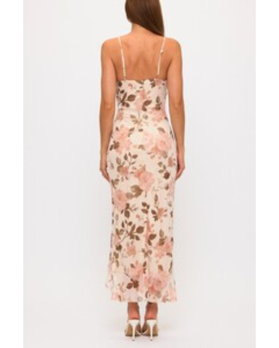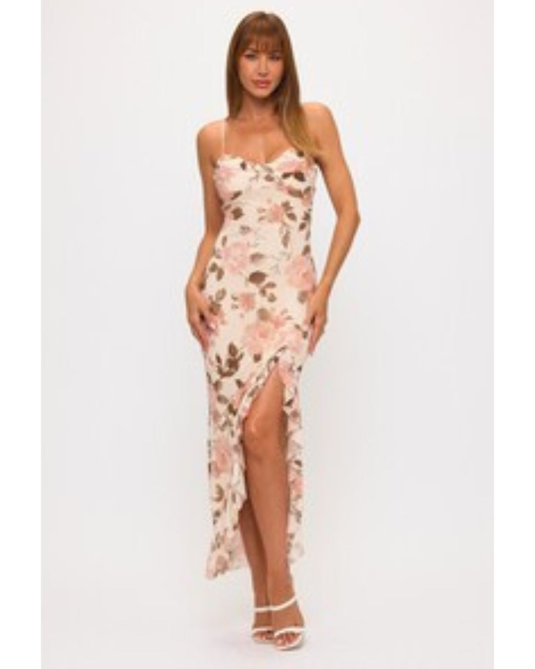 Turn heads in this stunning floral maxi dress that's equal parts romantic and playful. The mesh wet print creates an eye-catching look, while the sweetheart neckline and pleated bust detail draw attention exactly where you want it. Built-in bra cups keep you supported and comfortable all day long. Adjustable shoulder straps ensure the perfect fit, and the side slit with ruffled hem adds a cheeky touch of movement and sass. Fully lined for confidence, this A-line silhouette flatters every figure and takes you from brunch to evening with effortless style.