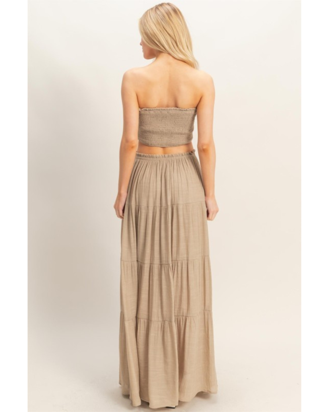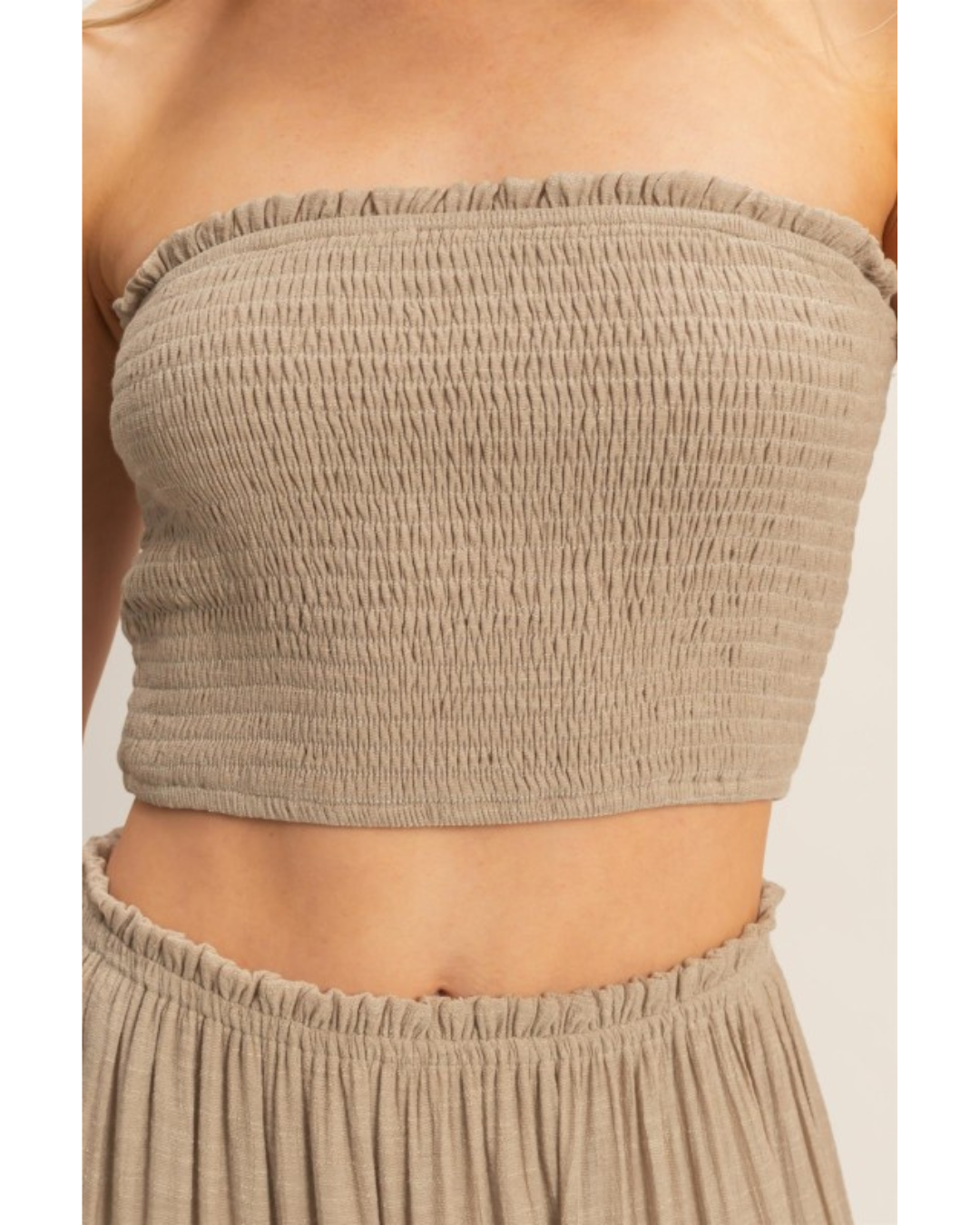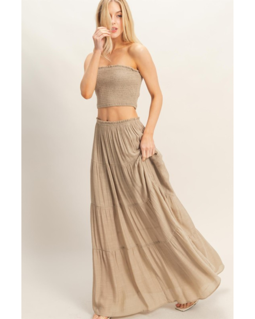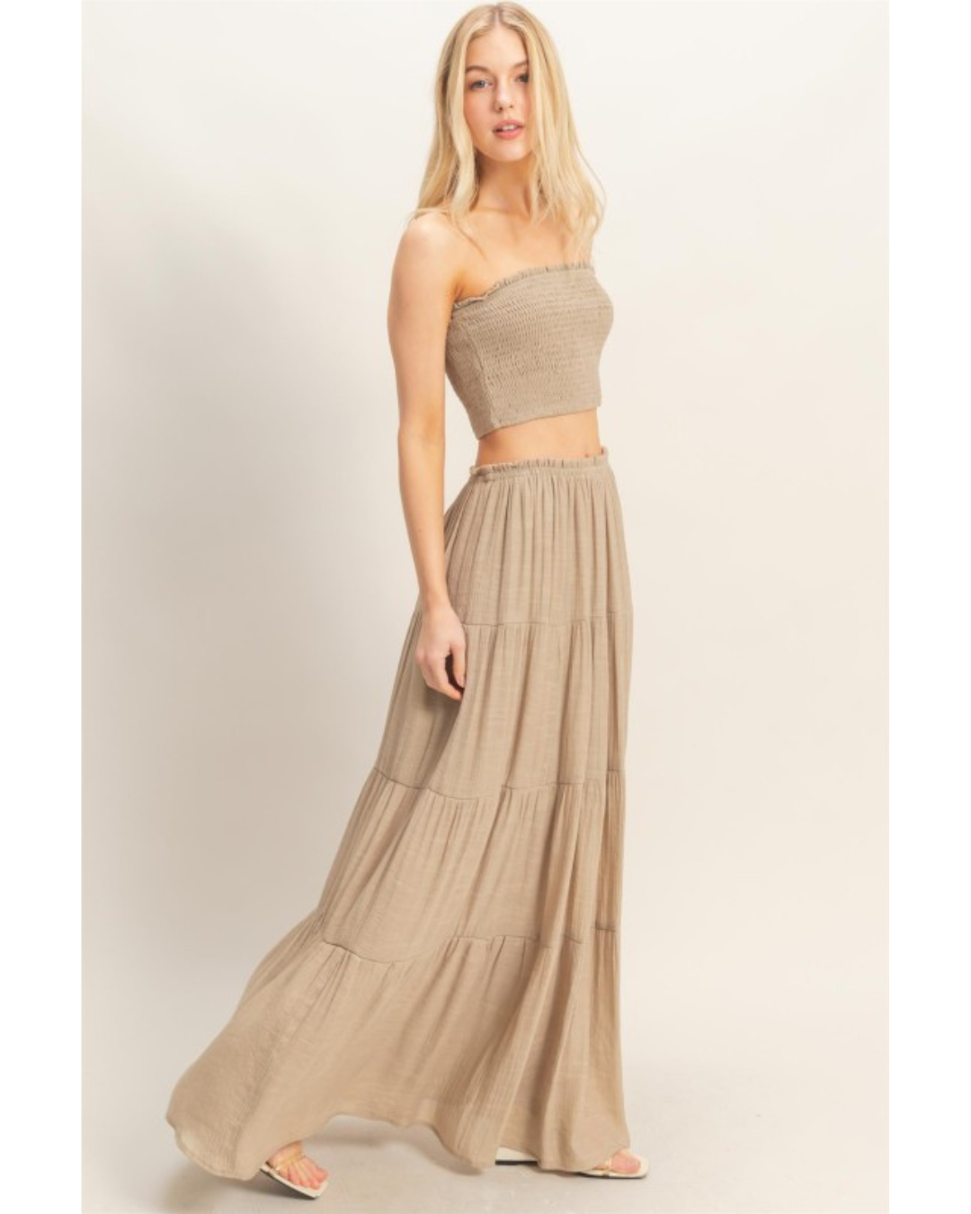 Effortlessly chic, the Ziva Smocked Set combines a fitted smocked tube top with a gracefully tiered skirt for versatile everyday wear. The stretchy top hugs comfortably while the relaxed skirt flows beautifully, making it ideal for layering or wearing solo. Style with a statement necklace and sandals for an easy, breezy aesthetic that transitions seamlessly from day to evening.